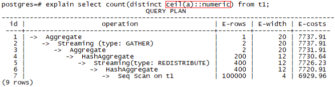 (3)需要进行网络重分布操作。在进行表的关联,聚集操作时,如果涉及表分布键的操作,可以在本地并行进行。但如果涉及到类型转换,则hash值发生变化,需要进行网络重分布,增加了网络开销。