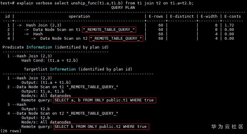 通常情况下,我们不支持不下推函数、复合类型、复杂语法及组合(例如:某些场景的with recursive语法,rollup函数+多count(distinct)语法)的下推,所以应该尽量避免在语句中使用以上元素。在客户场景中,经常遇到函数不能下推导致的问题,本篇博文重点以函数下推为例,讲述如何解决类似的问题。如下图计划所示,在语句中包含了不支持下推的函数unship_func(),导致整个计划不能下推,计划中出现“REMOTE_TABLE_QUERY”的字样,即会出现上述的瓶颈问题。遇到类似问题,需要根据具体应用场景,为函数设置合理的下推属性,使其可以下推。