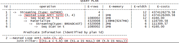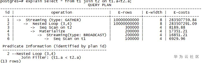 在GaussDB(DWS)中,我们推荐使用等值关联,这样可以使用HashJoin进行执行加速。但对于非等值关联条件,只能使用NestLoop的方式进行连接,同时需要将其中一个表进行Broadcast广播到所有DN进行。如果两个表都比较大,将导致性能瓶颈。例如如下: