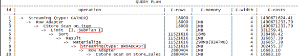 在分布式框架下,为了保证每一行父查询元组均能够在子查询中迭代计算出结果,需要所有DN均维护一份子查询表的全局数据,在上面的计划中,子查询中的store_sales表进行了广播和物化,将数据存在所有DN上,见8层算子。第3层算子每一行数据均需要通过迭代子查询计算(第4层及之下的SubPlan 1)获得是否匹配的信息。这个计划执行非常慢且耗费资源,原因是: