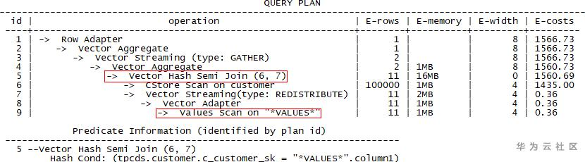 通常情况下,会生成基表扫描的查询计划,即对于customer表的每一条,需要检查c_customer_sk列是否会和IN list中的某个值匹配,匹配即返回该条元组。当IN list中的条件比较多时,匹配近似于NestLoop的操作。针对这种场景,GaussDB(DWS)实现了In list to Join的查询优化规则,根据代价估算,针对In list中的值较多的场景,生成Hash Join的计划,极大提升性能,如下图所示: