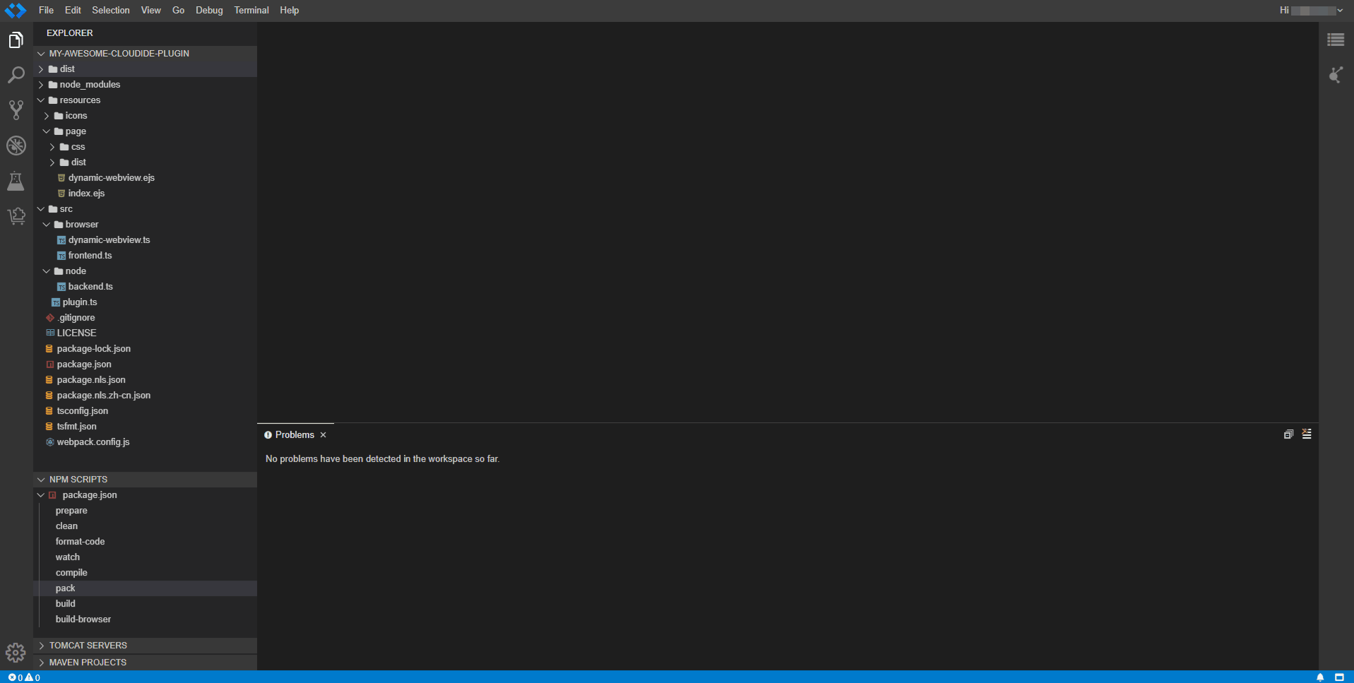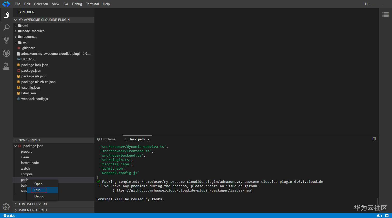 运行完成可以看到项目根目录出现打包出来的以'.cloudide'为结尾的插件安装包