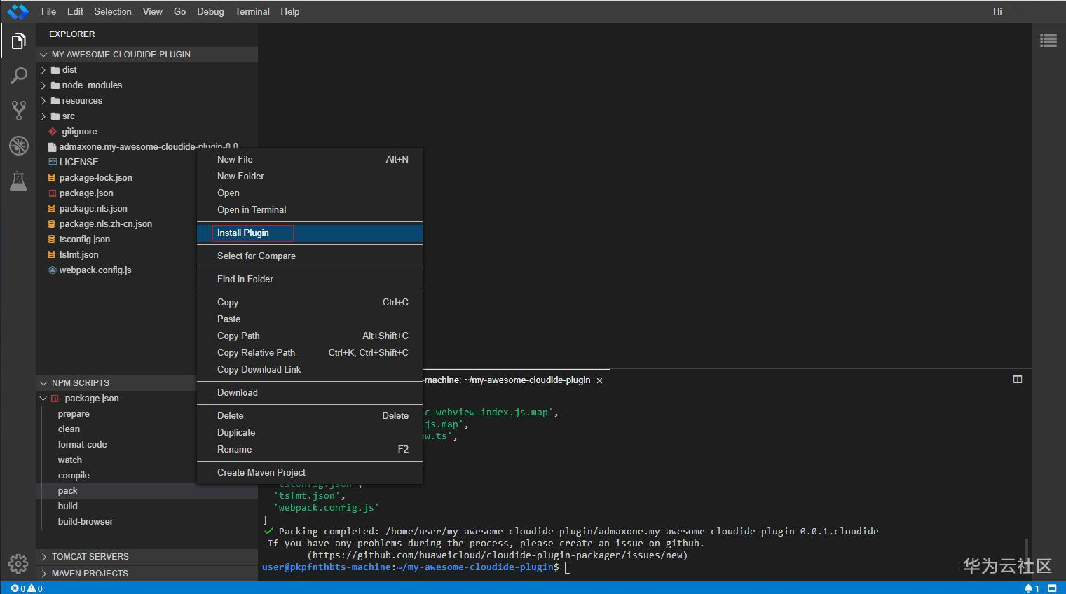 打包出来的插件安装包可以在直接在通过右键菜单进行安装,右键点击打包出来的'.cloudide'插件包,选择'Install Plugin',插件安装完成之后将自动激活。