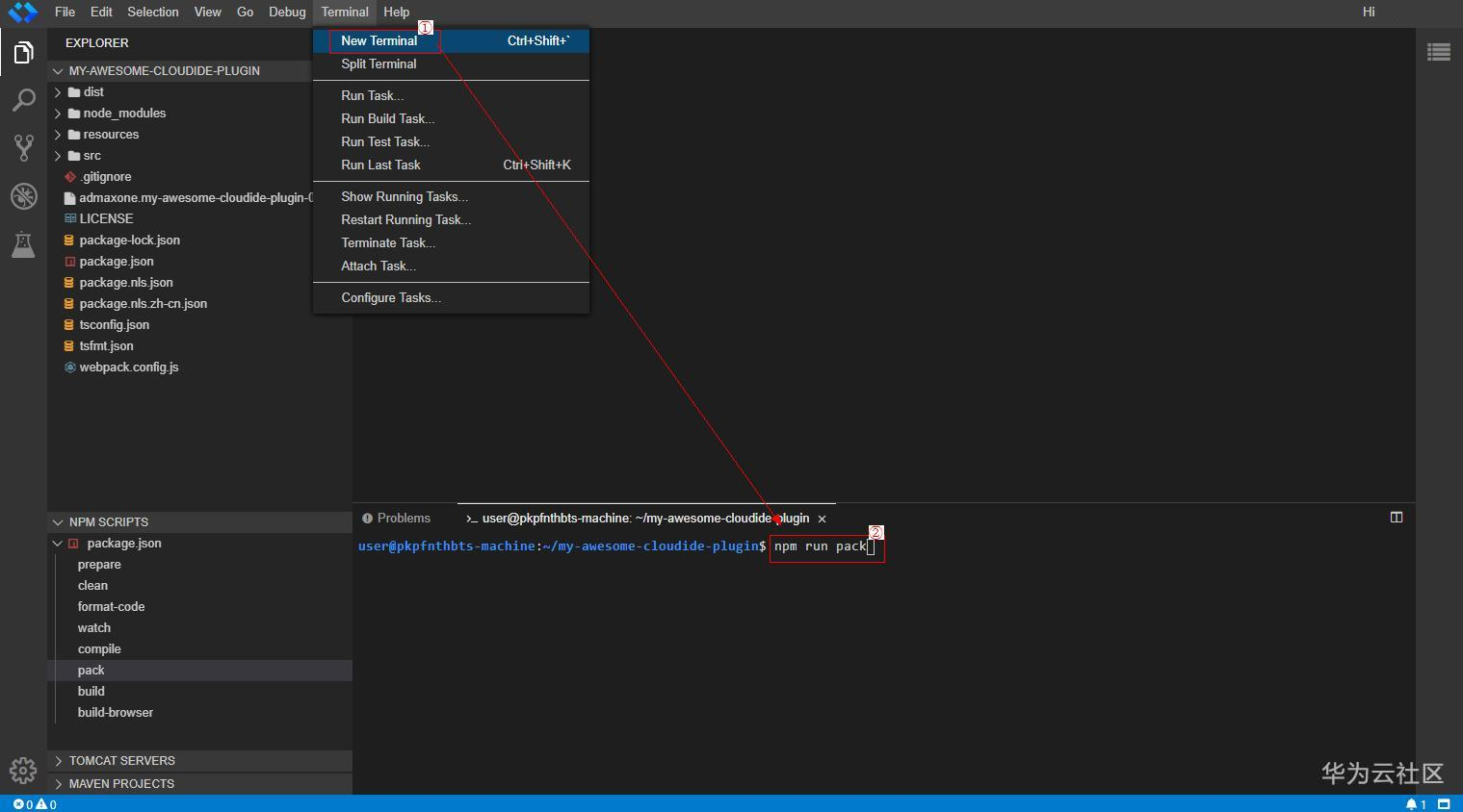 插件项目可以通过执行npm run pack进行打包,目前有两种方式可以执行该命令