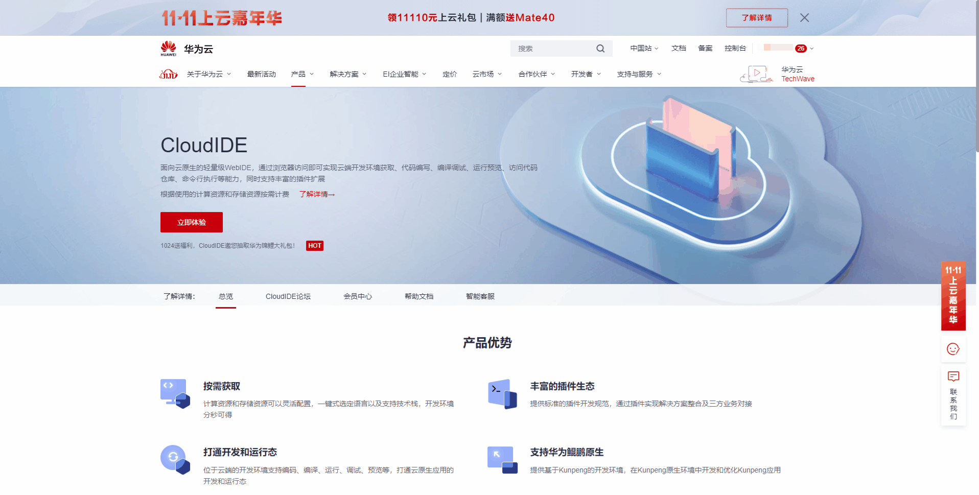 华为云CloudIDE的插件开发可以完全在CloudIDE上进行,不需要本地安装任何软件,所以第一步我们可以先申请一个CloudIDE实例作为我们的开发环境(不想看文字的读者可以直接参考动图进行环境创建)。