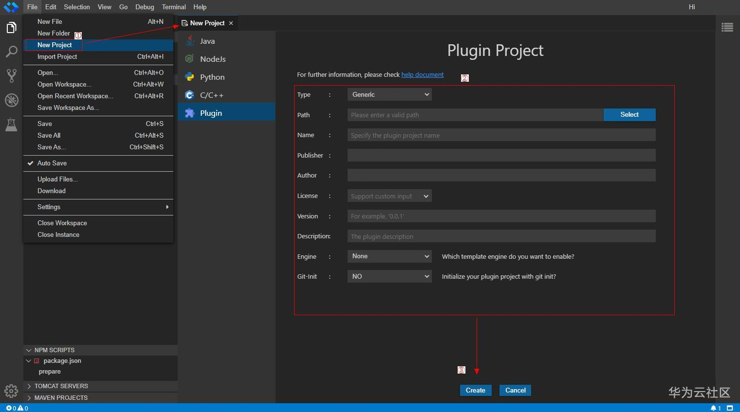 进入实例之后我们可以开始插件项目的创建,分为如下步骤: