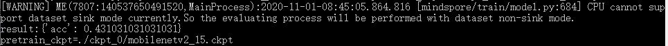 python eval.py --platform CPU --dataset_path ./data/test --pretrain_ckpt ./ckpt_0/mobilenetv2_15.ckpt