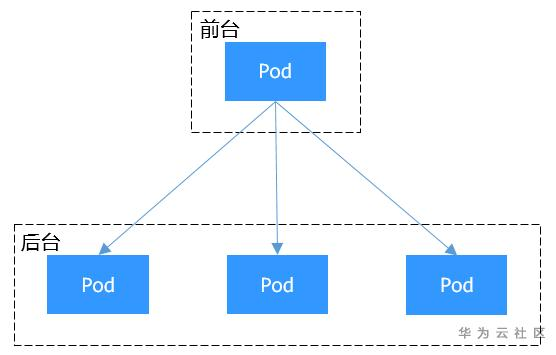 那么对于上面的例子,为后台添加一个Service,通过Service来访问Pod,这样前台Pod就无需感知后台Pod的变化,如图2所示。