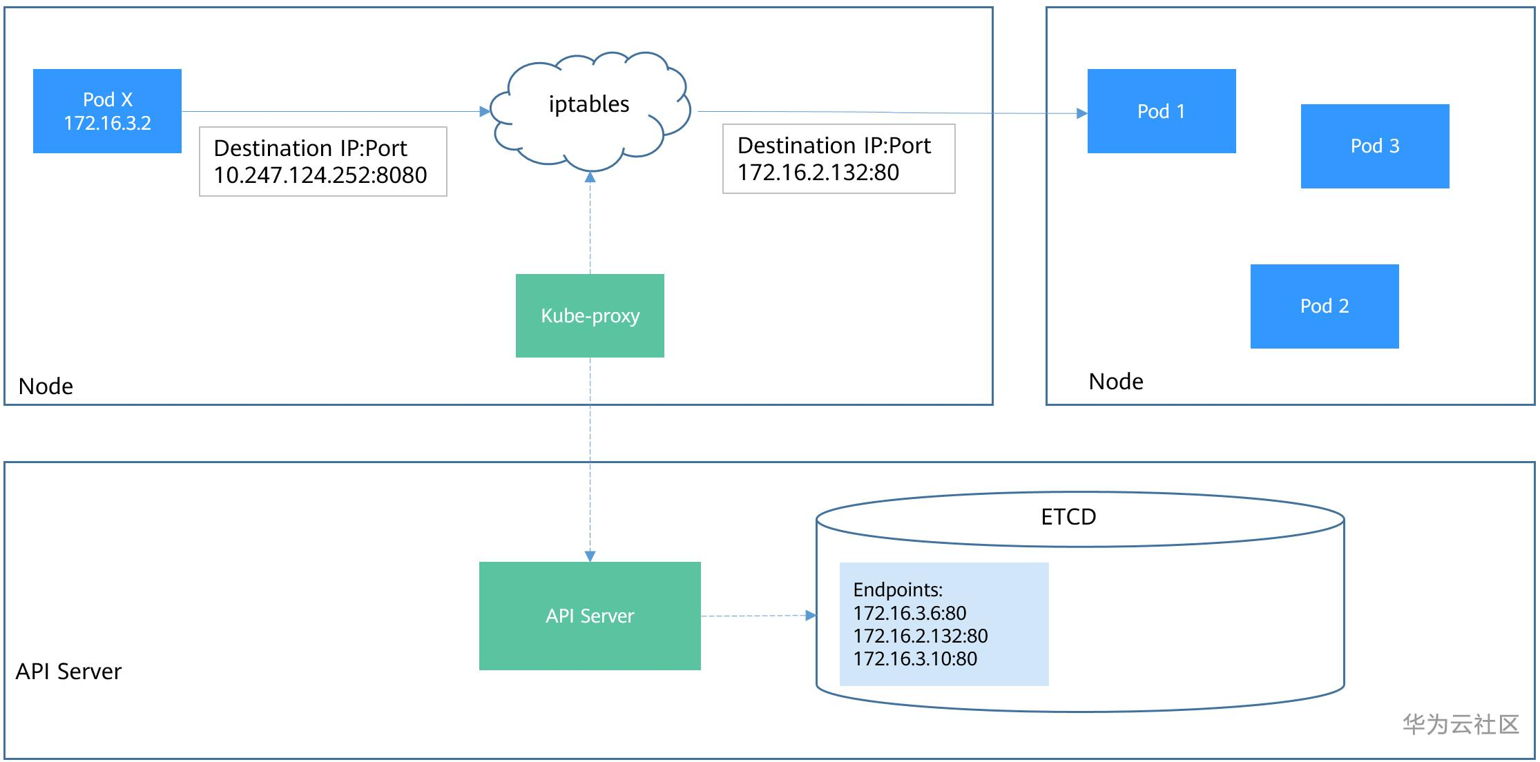下图是一个实际访问Service的图示,Pod X访问Service(10.247.124.252:8080),在往外发数据包时,在节点上根据iptables规则目的IP:Port被随机替换为Pod1的IP:Port,从而通过Service访问到实际的Pod。