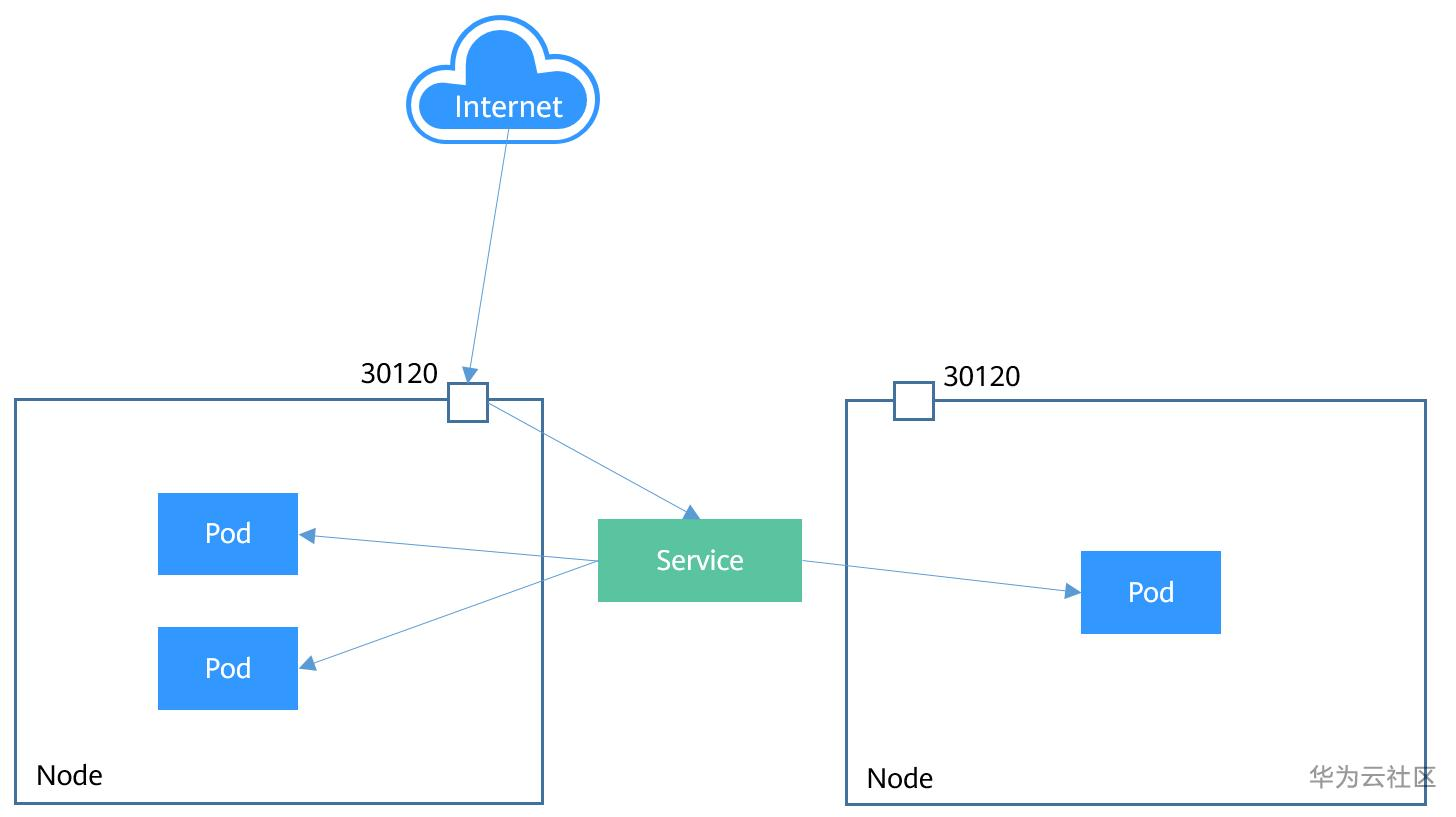 NodePort:用于从集群外部访问的场景,通过节点上的端口访问Service,详细介绍请参见NodePort类型的Service。