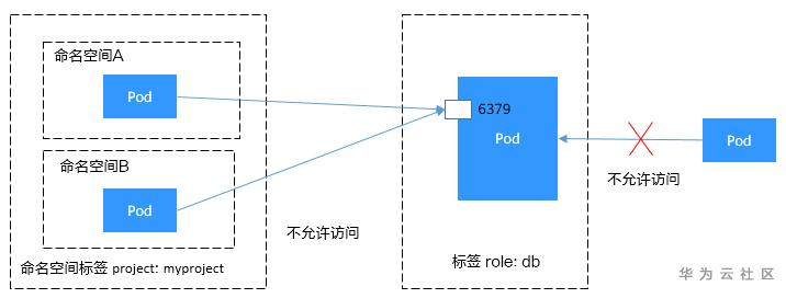 - namespaceSelector: # 只允许具有project=myproject标签的命名空间中的Pod访问
