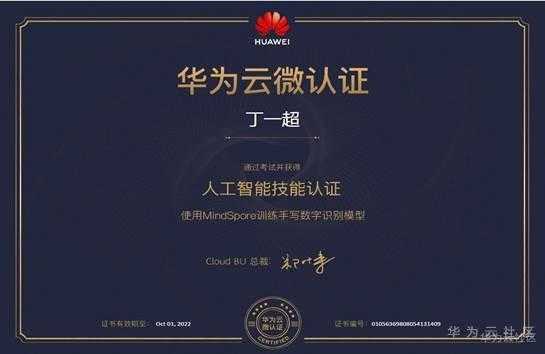 在今年9月份的HC大会上,丁一超又一次感受到了ModelArts的强大,对ModelArts又有了更深入的了解和学习的渴望。与此同时,在26号的ModelArts+HiLens的小型闭门研讨会上,他结合自己的经历讲述了在AI实战营的经历和体会,为参会的小伙伴们带去了精彩的分享。随后,丁一超通过学习一次性通过了华为云Mindspore微认证的考试。