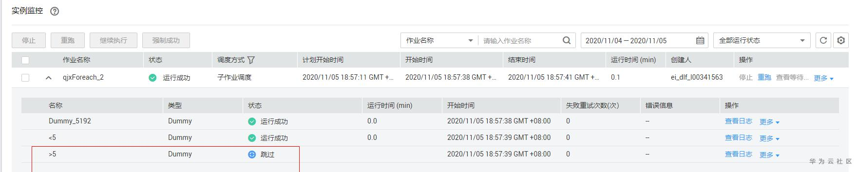 参照图2,Foreach子作业中设置了两个条件分支,具体的条件设置如下图。当hive脚本输出的结果大于5的时候,执行上面一条路。当hive脚本的输出结果小于5的时候,执行下面一条路。从实例监控中可以看到执行结果是符合我们预期的,当前select出来的结果是2, 2< 5, 所以>5这个分支被跳过,workflow执行<5这个分支