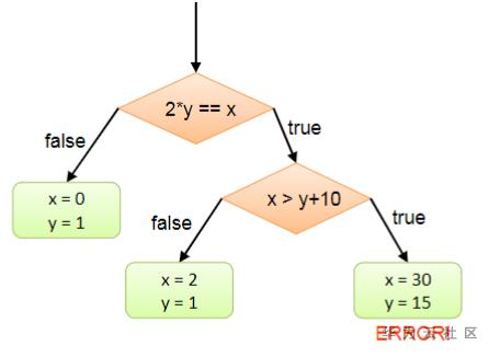 混合测试将路径约束中的连接((x0 > y0 + 10))取反,会生成一个新约束(x0 = 2y0)∧(x0 ≤ y0 + 10)的测试,求解得到测试输入{x=30, y=15}。在这个输入下程序走到ERROR语句。