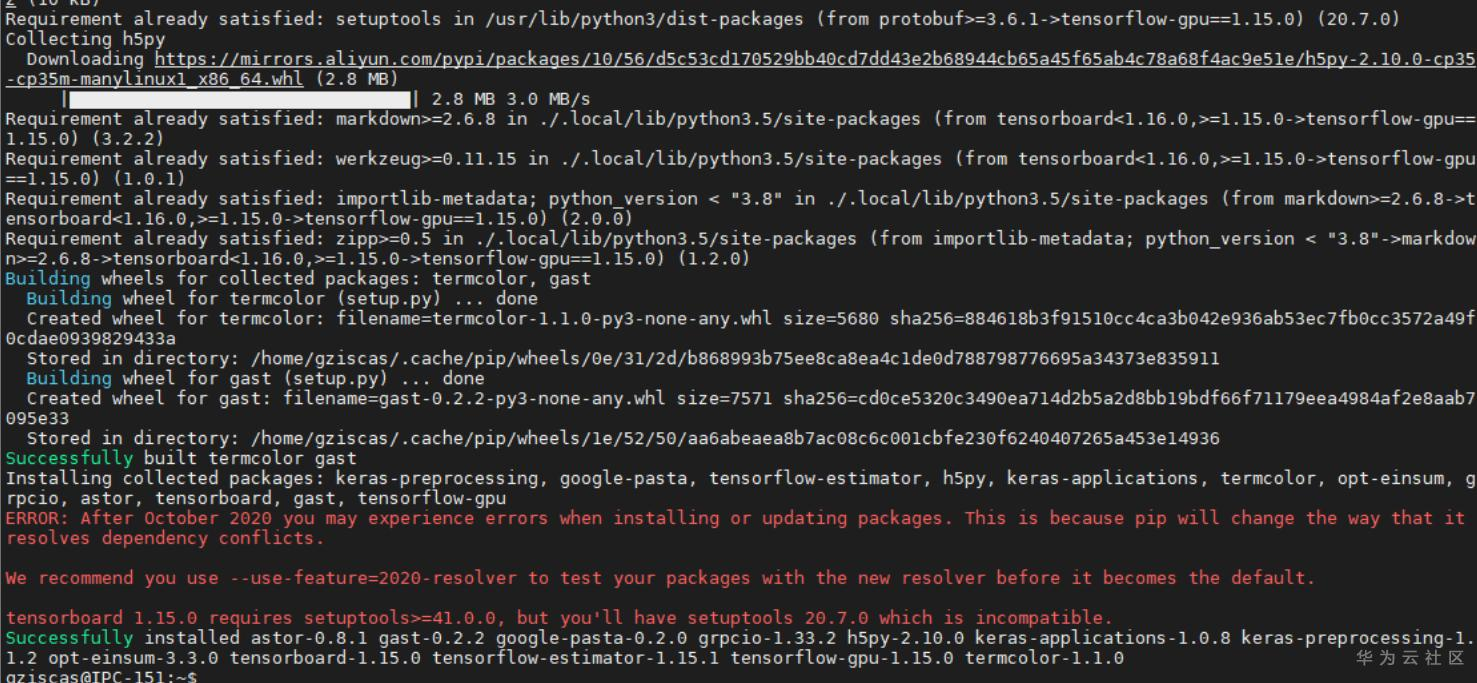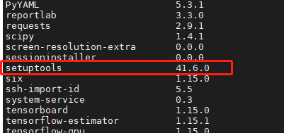 这里看到成功安装 tensorflow-gpu==1.15.0后;但是需要注意红色字,说tensorflow-gpu==1.15.0 需要 setuptools 版本大于41.0.0,当前系统版本为20.7.0;那简单,直接升级安装setuptools>=41.0.0就可以了;