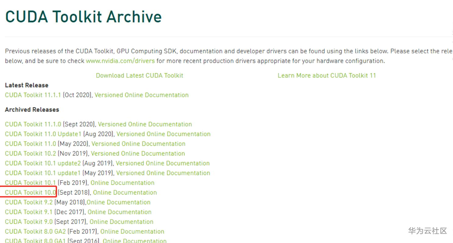 首先在CUDA Toolkit Archive网页找到 CUDA Toolkit 10.0 地址:https://developer.nvidia.com/CUDA-TOOLKIT-ARCHIVE