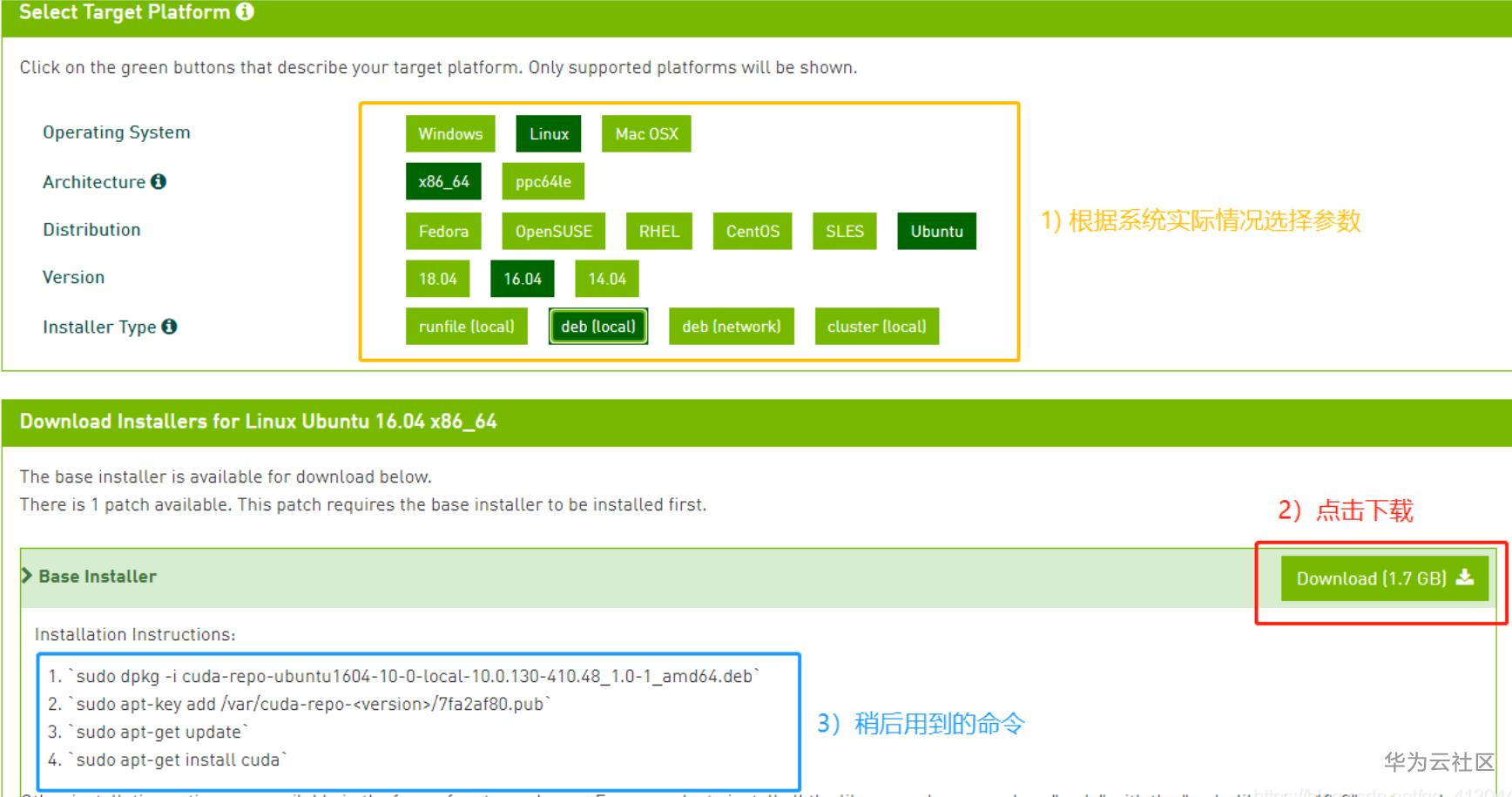 选择对应的系统参数,下载CUDA Toolkit 10.0文件: