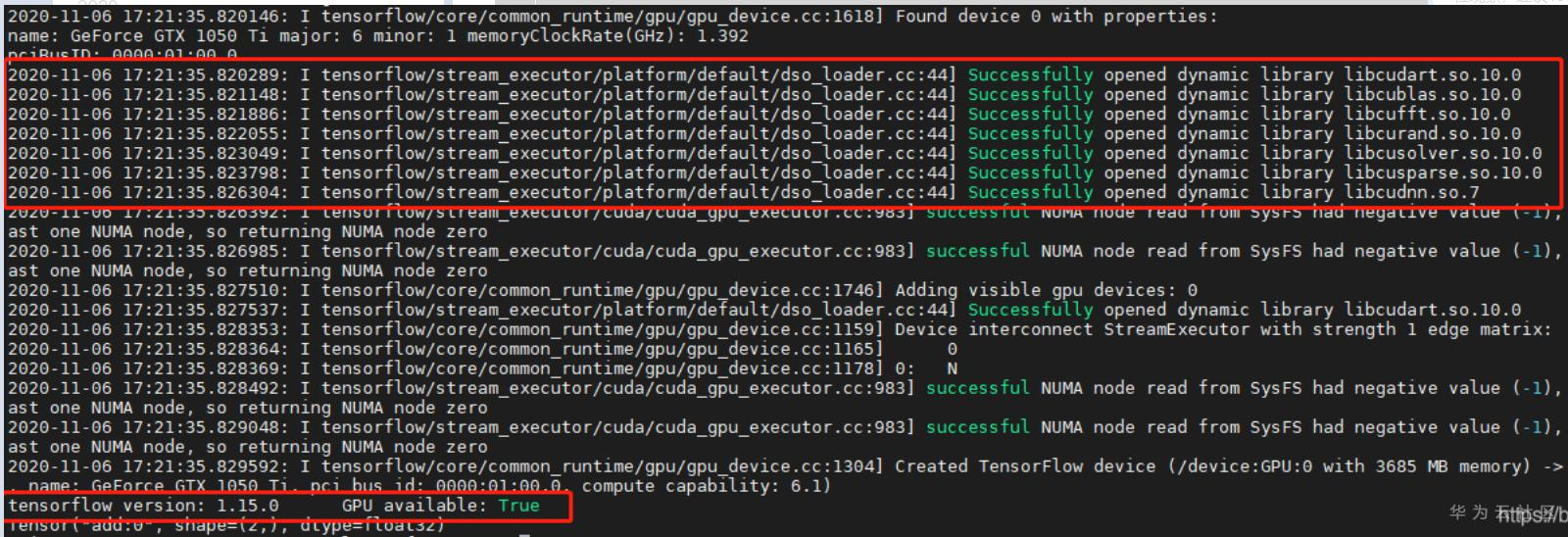 能看到GPU版的TensorFlow开发环境搭建成功了。