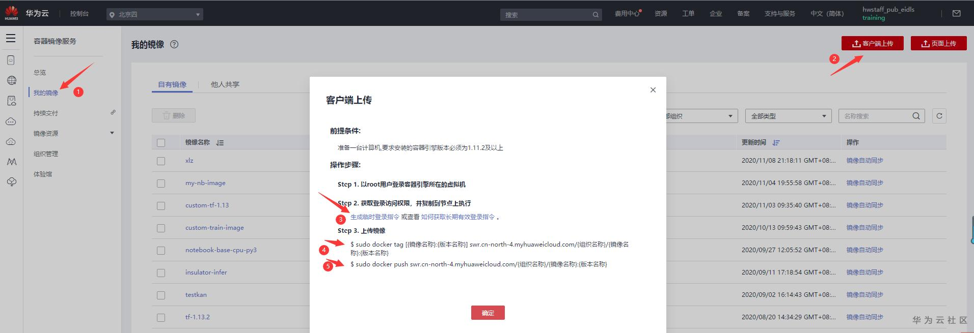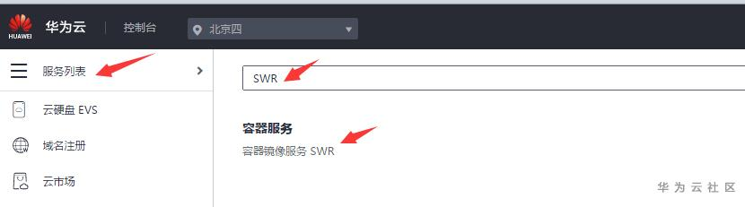 3.1) 如上在本地验证自己构建的镜像功能OK之后,登陆华为云账号,选择SWR 服务,按服务使用说明将刚才构建的镜像传到华为云SWR上。