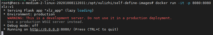 2.1) 在该电脑上执行命令 “docker run -it -p 8080:8080 xlz:v1”启动自定义镜像,如下图所示: