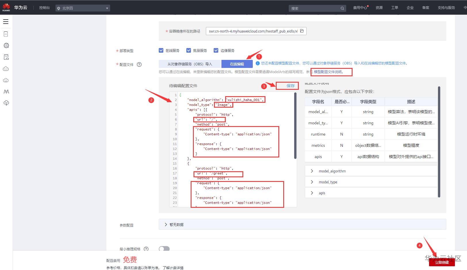 4.4) 选择在线编辑配置文件,详细要求参考页面上相关的编写指南链接,编辑完后记得点保存,无错误提示后点立即创建。