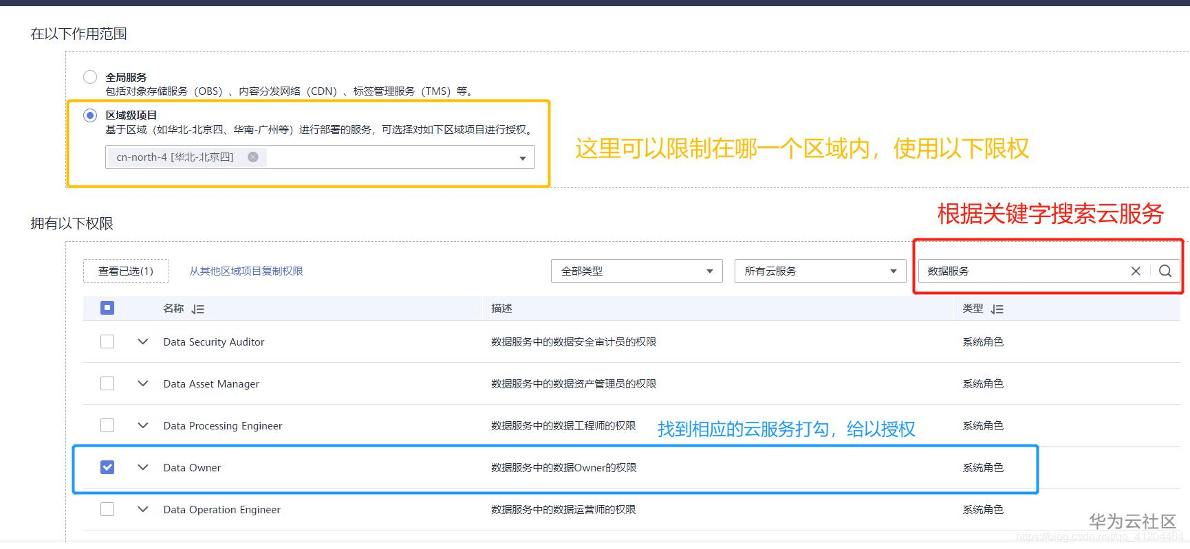 点击确定,这样就为 Data_owner_Group用户组,在华北-北京四的区域下,授予 Data Owner 云服务的权限。