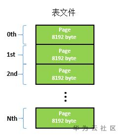 行存表的数据文(表、索引、cudesc表等文件),被划分为多个固定大小的page页面(block),每个page页面默认大小为8K,页面编号(block number)从0开始计数。如果当前page页面已经存满,则在末尾会新增一个page,继续存储。