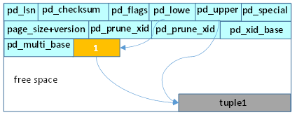 (1)假设有一张表仅包含了一个tuple,那么该page header的pd_lower指向line pointers的第一个。在line pointers末尾和最后一个tuple之前的空间被称为free space。为了能够唯一确定页内的tuple,常用ctid(block number, offset)唯一确定对应的tuple。