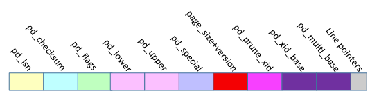 行存表的page页面主要由page header(页头)、空闲空间、数据heap tuple组成,下图展示了page页头各个字段的存储信息: