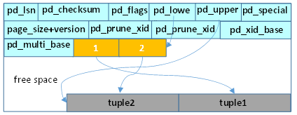 (2)当插入第二个tuple,则生成line pointer递增,并指向第二个tuple。与此同时,pd_lower、pd_upper更新对应的指向,具体可见下图说明。