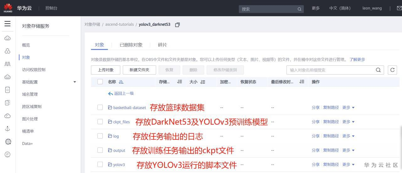 5. 上传 YOLOv3 ckpt 文件、篮球比赛视频和修改后的源代码到 obs 桶