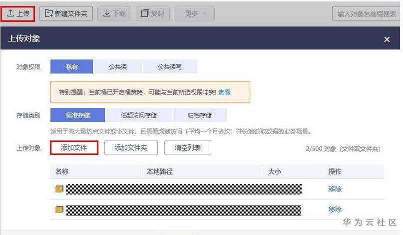 (4)点击桶名称,进入到桶中,点击“新建文件夹”,输入文件夹名称,如“train_input”,点击进入文件夹,再新建“datasets”,点击“上传”->“添加文件”-> 选择本地下载好的数据集压缩包(之所以选压缩包格式是因为如果数据集比较大,上传压缩包比上传文件夹快很多) –> 确定,如下图所示;