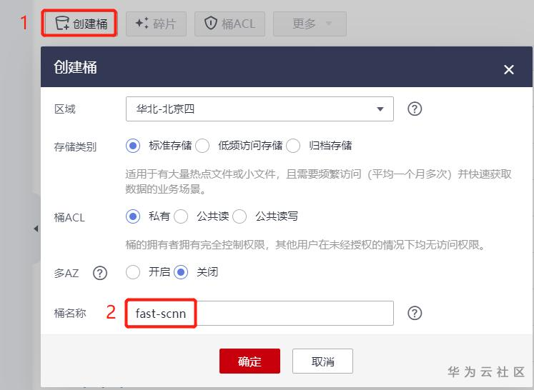 (3)参考下图,点击“创建桶”,输入桶名称,注意:区域要选择华北-北京四、标准存储、私有、关闭多AZ,桶名需自定义,OBS桶名要全局唯一,如提示桶名已存在,则需要您修改为其他名称,比如本文设置桶名为fast-scnn。您设置的桶名必须与此不同,如在下文的操作指导中看到fast-scnn,请主动将桶名替换为您自己的桶名,下文将不再进行提示;