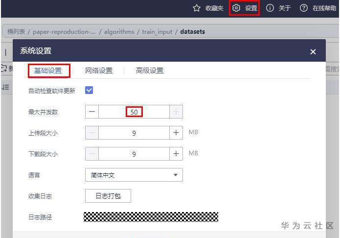 (5)点击OBS Browser+左侧的“任务管理”,可查看数据上传进度。如下图所示,点击设置,在基础设置中,设置最大并发数为最大值50,可以加快数据上传速度