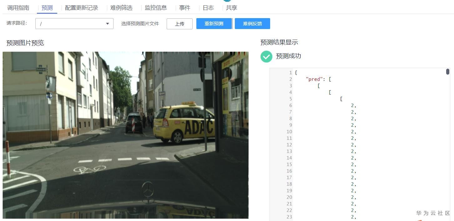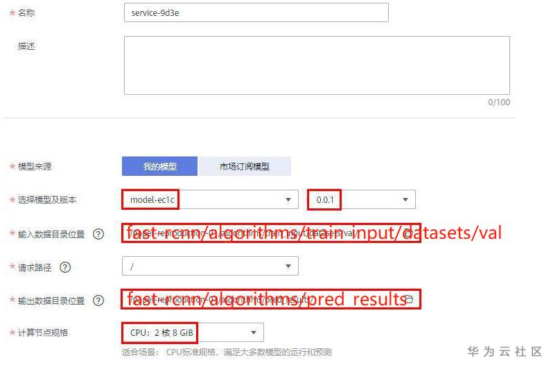 在ModelArts上,可以将模型部署为在线服务,然后上传图片进行预测,直接在网页端观察预测结果,本算法支持CPU和GPU部署。