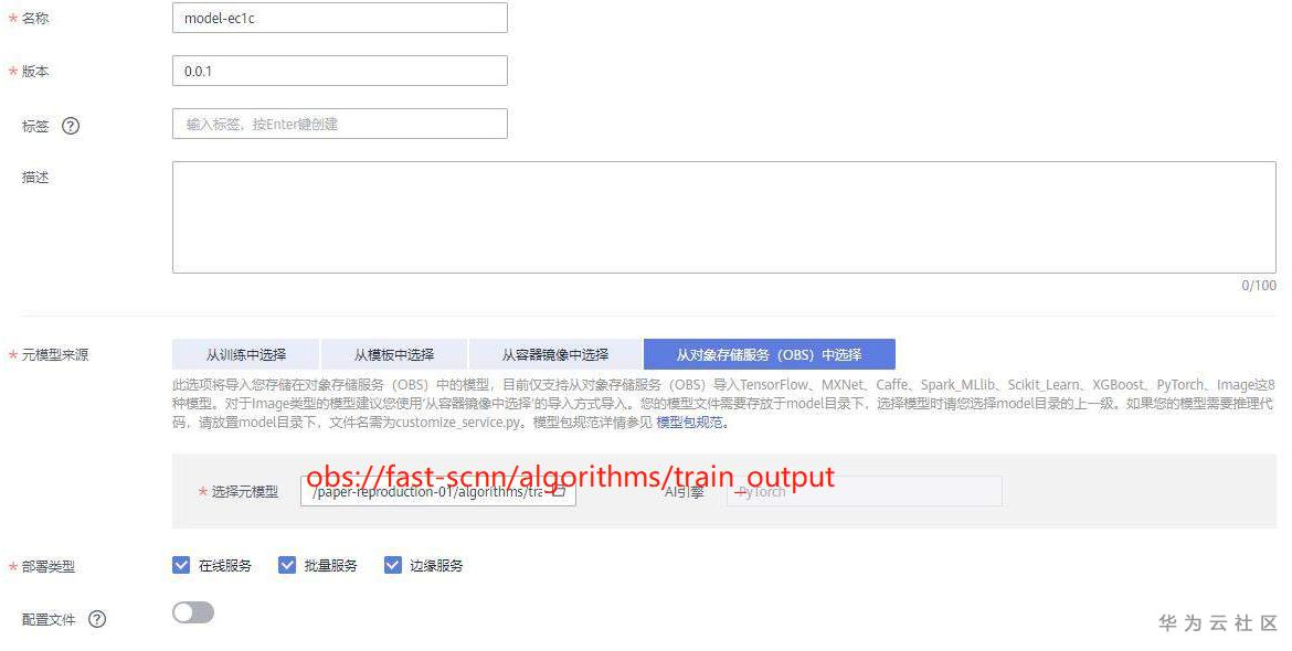 (1)在ModelArts控制台的左侧导航栏点击“模型管理” -> “模型”,点击右侧页面中的“导入”。在导入模型页面填写名称,选择元模型来源,可以直接从训练中选择(推荐使用这种方法,简单方便,与训练无缝衔接),也可以从OBS中选择。如果是从OBS中选择,则需要选择到model目录的上一级目录;例如,本次可选择的目录为obs://fast-scnn/algorithms/train_output,如下图所示: