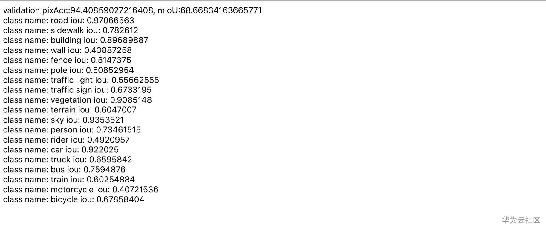 点击下一步,提交,训练作业的状态会经历“初始化”、“部署中”、“运行中”和“运行成功”四个状态。训练作业运行成功后,在上表中指定的“模型输出”路径下会自动生成_result目录,其中包含推理后的.png图片和推理结果_results.txt文件。其中_results.txt文件包含验证结果,如图所示。