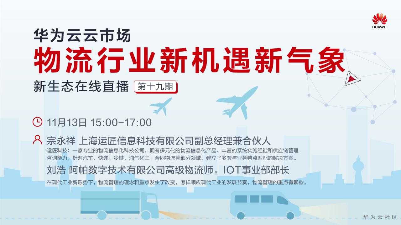 直播地址:https://bbs.huaweicloud.cn/webinar/100023(选择新生态在线直播—物流行业新机遇新气象)