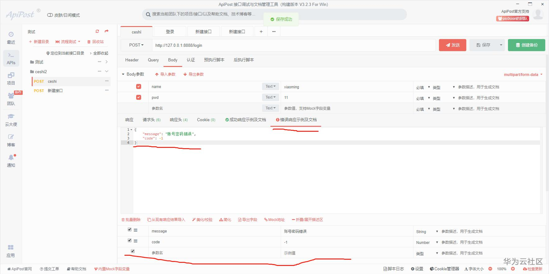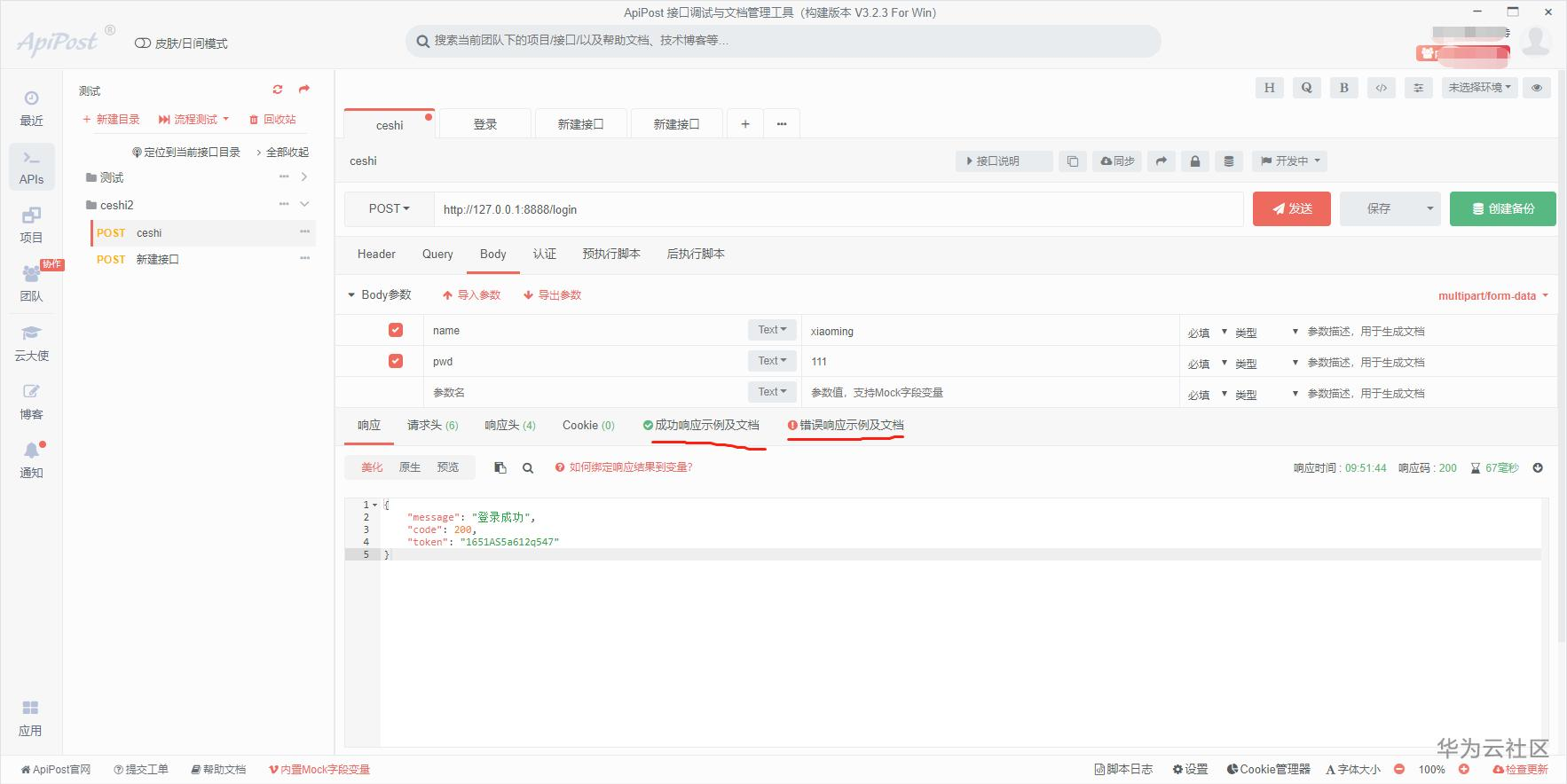 它这里有两个功能,成功响应示例及文档和错误响应示例及文档