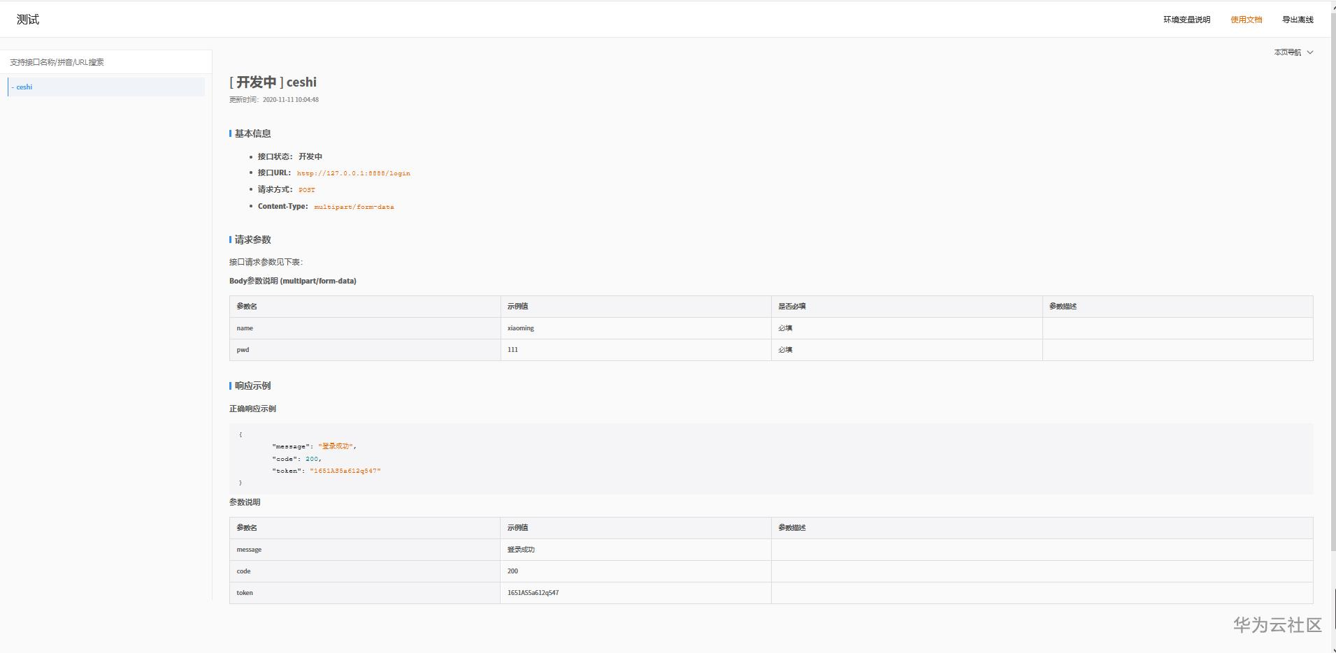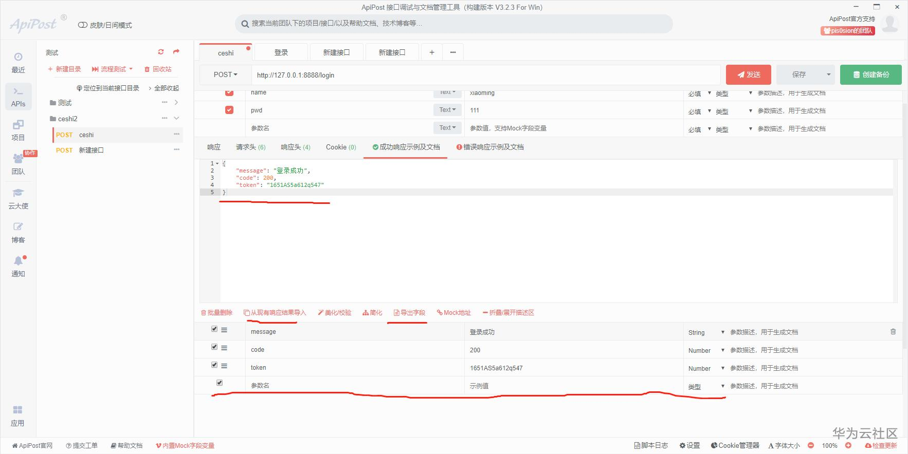 【摘要】 接口文档是一个项目开发中必需的说明文档,但时接口文档编写起来比较费事费力。本文为大家推荐一款特别好用的接口文档生成工具--apipostapipost是一款国产的接口测试和接口文档生成的工具。其中它接口文档生成的功能特别强大。打开apipost编写一个登录的接口请求它这里有两个功能,成功响应示例及文档和错误响应示例及文档成功响应示例文档,我们点击从现有响应结果导入和导出字段,获得如图效果分享...