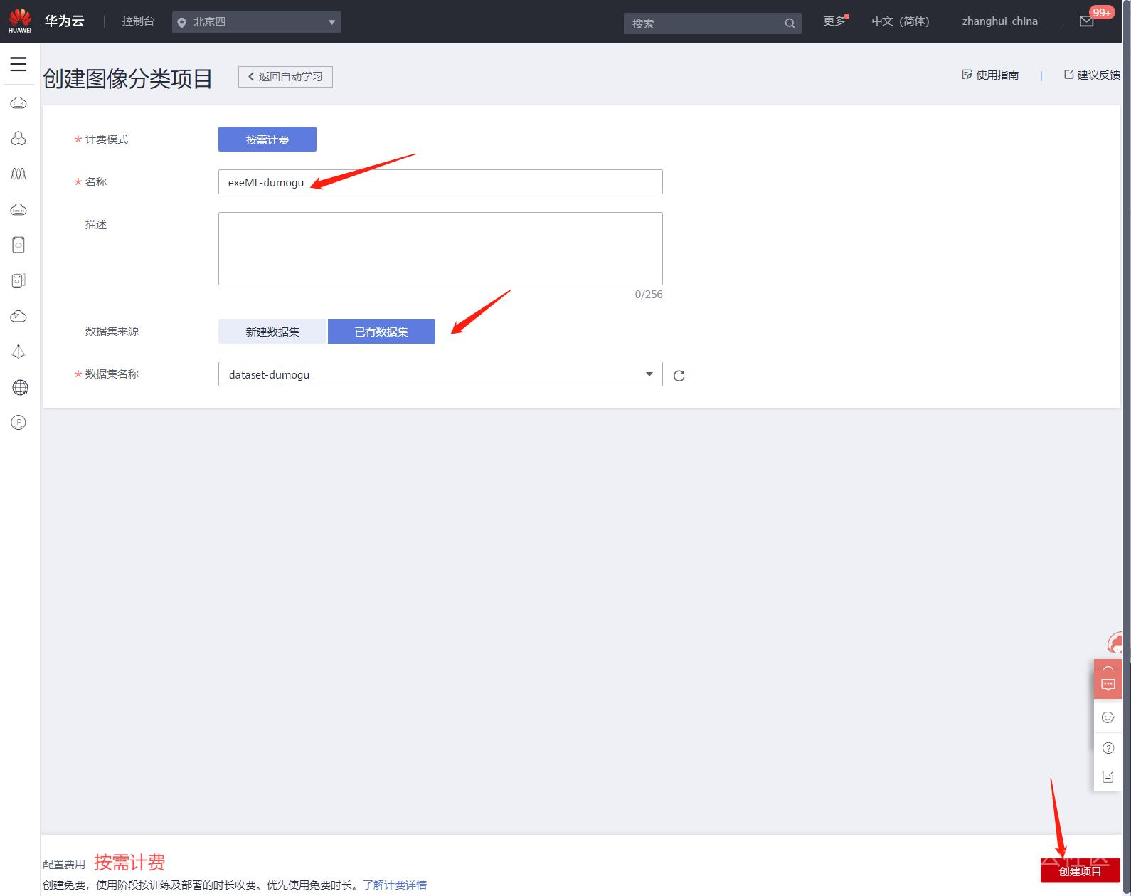 点击创建项目,输入名称: exeML-dumogu,选择”已有数据集“并选中刚才创建的dataset-dumogu数据集。