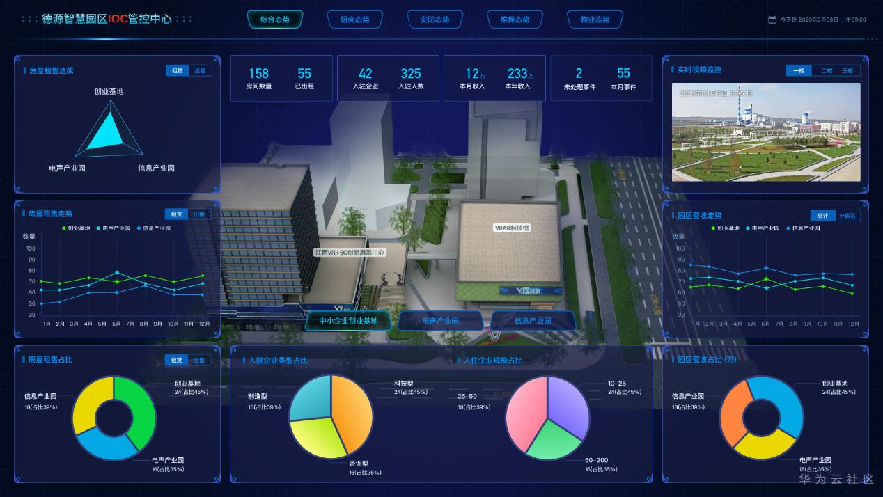 5、建设IOC智慧管控中心,通过大数据分析技术对园区运营过程中的招商、物业、安防、维保等数据进行分析展示,生成各类统计图表。协助运营人员“一屏览全园”;协助安保人员及时处理突发状况,做到“事件可控、可管”;协助维保管理员及时了解园区设备的最新维保情况,制定合理的维修保养计划,提高作业效率;协助运营人员及时掌握园区的房屋招商信息及入驻企业的类新、规模等情况,为制定科学的、高效的招商引资政策提供数据支持。