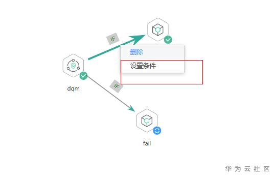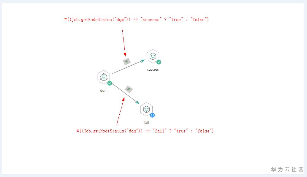 此Demo中使用的EL表达式为#{Job.getNodeStatus("node_name")},这个表达式的作用为获取指定节点的执行状态,将括号中的node_name替换为具体的节点名称即可。当前该表达式只有两个返回值,success或者fail。如上图所示,当dqm这个节点执行结果为success的时候,执行上面的分支,当dqm这个节点执行结果为fail的时候,执行下面的分支。对应的EL表达式写法已经用红字在图1中标出。