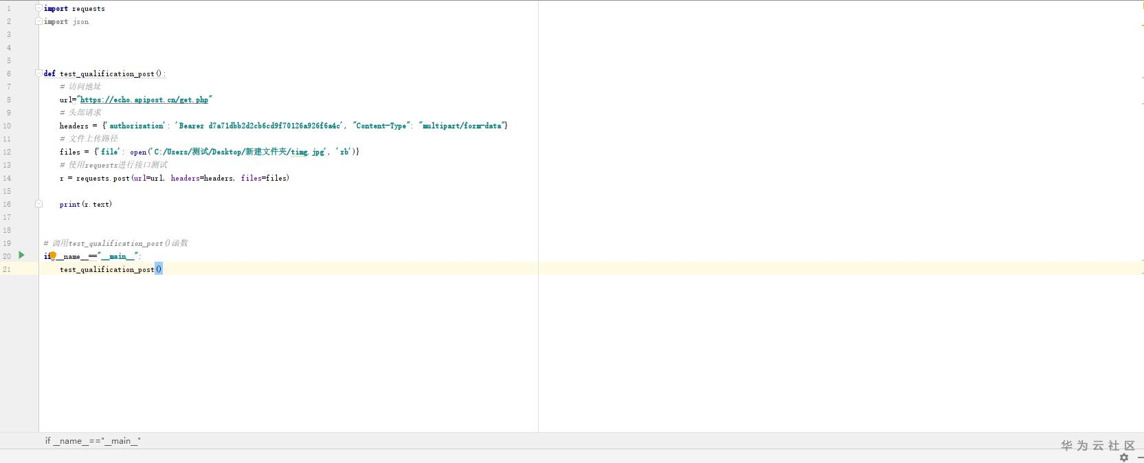 【摘要】 在做接口测试的时候,往往会有需要文件上传的接口,今天教大家使用apipost接口测试工具和python+requests脚本进行接口测试。一、使用python+requestspython+requests进行文档上传的接口测试的时候,需要调用files,不过需要注意读取文件上传的时候描述路径的格式,因为window 读取文件可以用\,但是在字符串中\是被当作转义字符来使用。三种解决办法:1...