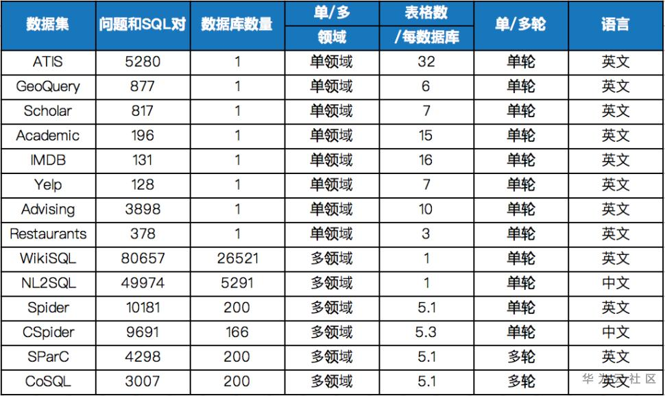 WikiSQL是最常用的公开评测数据集之一,它所包含的NL2SQL任务比较简单,主要是单表单列查询,可以进行最大、最小、计数、求和以及平均聚合操作,支持大于、小于和等于的条件比较,仅支持“AND”的条件链接方式。