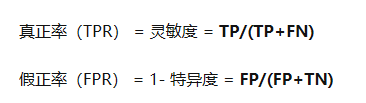 ROC(Receiver Operating Characteristic):以FPR(False Positive Rate,假正例率,假阳性率)为横坐标,TPR(True Positive Rate,真正例率,真阳性率)为纵坐标绘制的图。