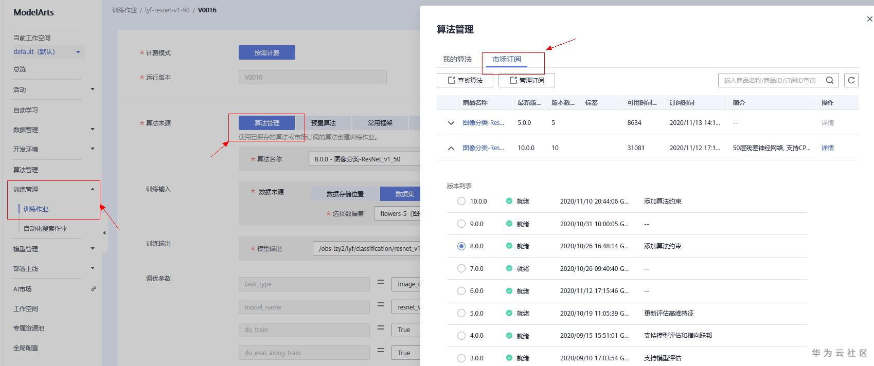 进入训练作业算法管理,选择市场订阅下来的算法创建训练作业,选择之前发布切分好的数据集,就可以开始训练了。