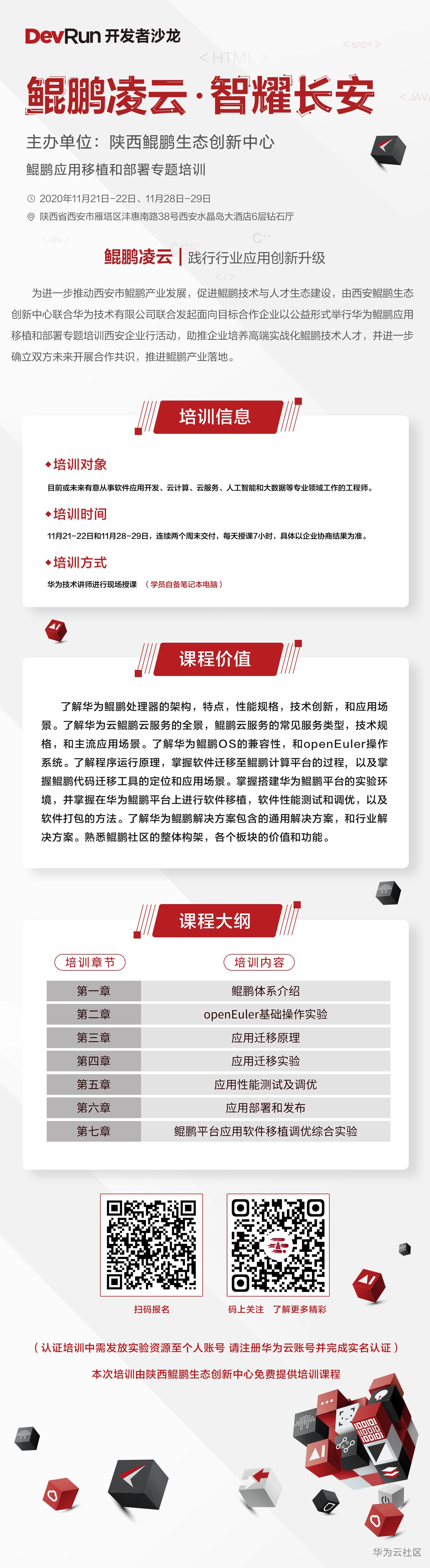 【摘要】 为推动鲲鹏计算产业人才培养、普及鲲鹏开发知识体系和鲲鹏应用开发者HCIA认证、帮助开发者提升开发者自身素质,促进产业升级,11月21、22日,以及11月28、29期间,陕西鲲鹏生态创新中心将面向区域重点ISV举办开发者赋能培训活动。