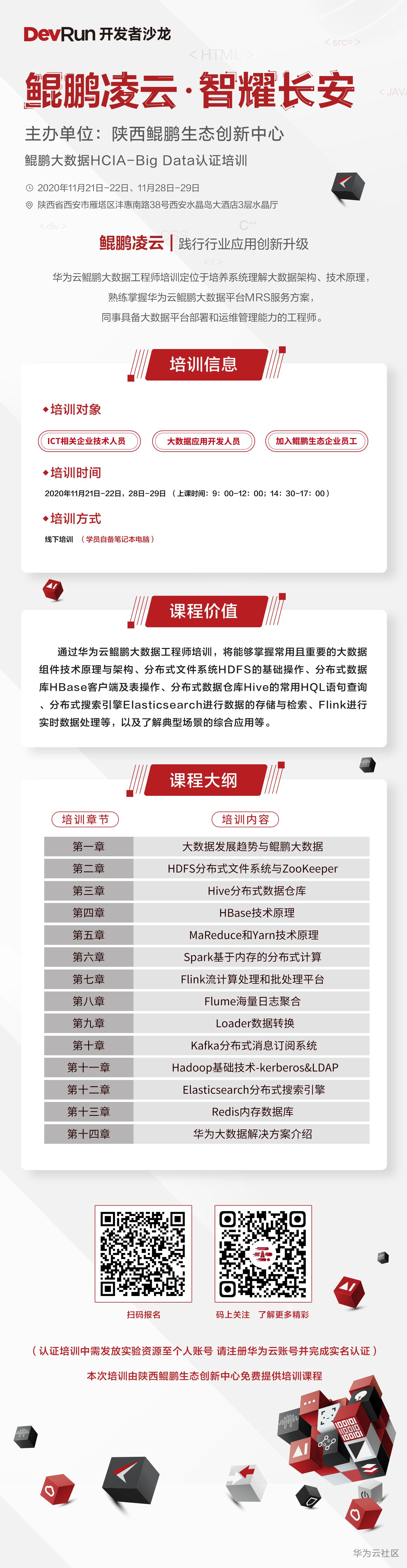 为了推动鲲鹏计算产业人才培养、普及鲲鹏开发知识体系、普及鲲鹏应用开发者HCIA证书、产业升级促进工程师提升自身素质,11月21、22日,以及11月28、29期间,陕西鲲鹏生态创新中心将面向区域重点ISV举办开发者赋能培训,该培训分为两个专题:鲲鹏应用移植和部署培训,鲲鹏大数据HCIA-Big Data认证培训。详情如下: