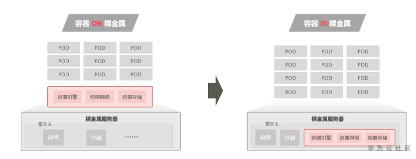 第一代裸金属容器基于 “容器 ON裸金属”架构,相比传统”容器 ON 虚拟机”,带来业务性能提升和成本优化,已成为业界的通用架构,但容器组件依然运行在服务器上,占用大量资源。华为云第二代裸金属容器,基于华为云擎天架构的深度软硬协同能力,将容器组件全部卸载到擎天卡上,实现“容器IN裸金属”,让服务器资源可100%用于业务处理,同时基于网络硬件直通能力和动态网络队列,网络性能提升40%,单容器PPS提升2倍,最终可使业务整体性能提升100%,成本节约30%。此外,第二代裸金属容器还实现与虚机、Serverless容器之间的跨资源弹性,最快可达30秒扩容1000容器。